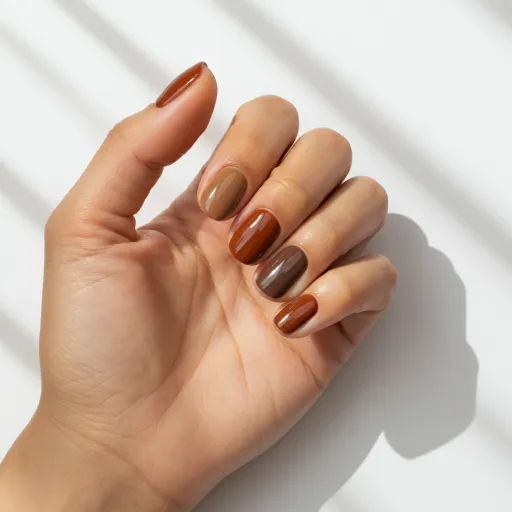 Brown mocha nails with a glossy neutral finish styled in a simple DIY design.