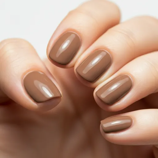Close-up of creamy mocha-colored nails with a soft glossy finish.