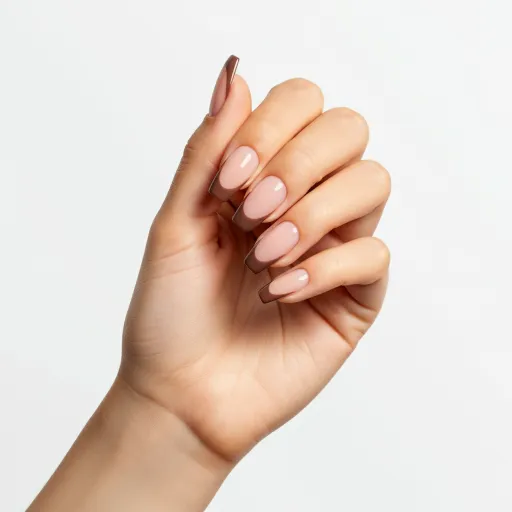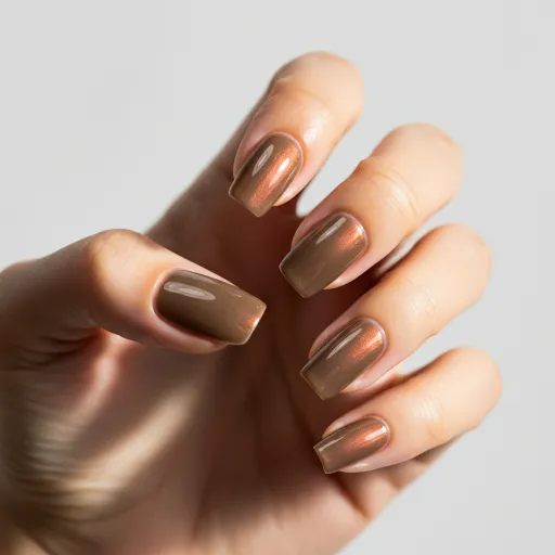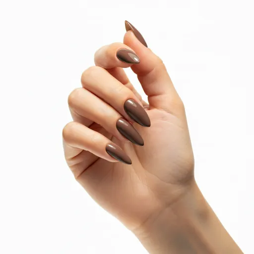 Hands with glossy mocha mousse nails featuring soft brown neutral tones in a minimalist style.
