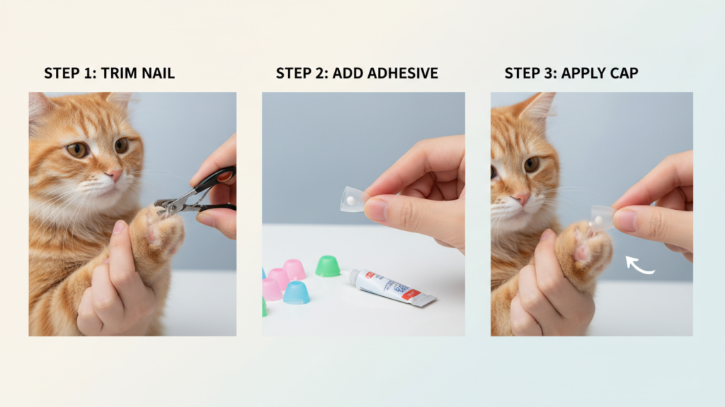 Nail caps are applied with pet-safe glue after trimming the cat’s claws.