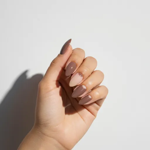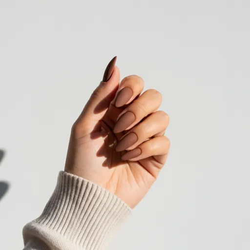 - Alt text: Close-up of stunning mocha mousse nails with matte and ombre finish on almond-shaped nails.