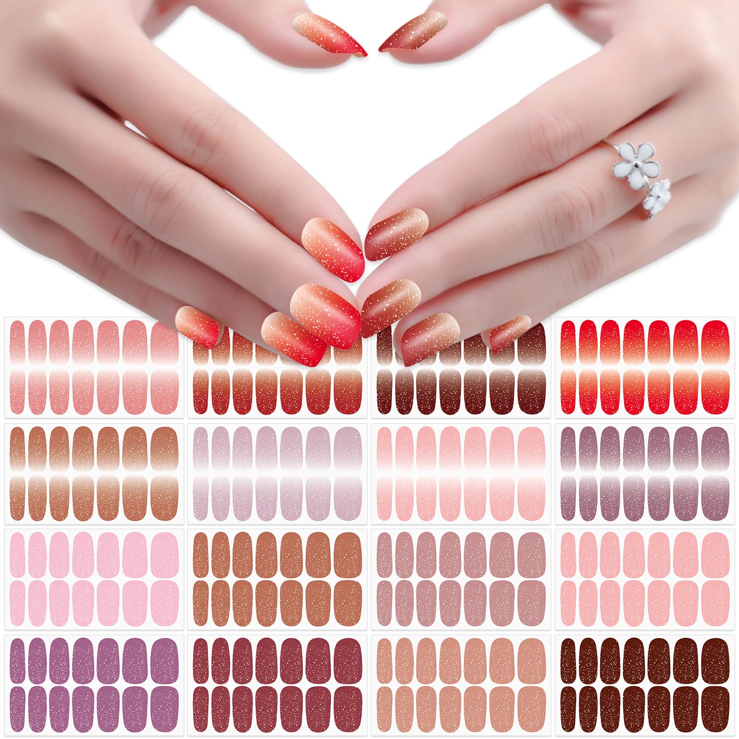 The wraps felt simple to use. Peeling and pressing them on took only minutes, and the included nail file trimmed the edges cleanly. They lay smoothly on short nails and gave a glossy, glittery finish that looked polished.