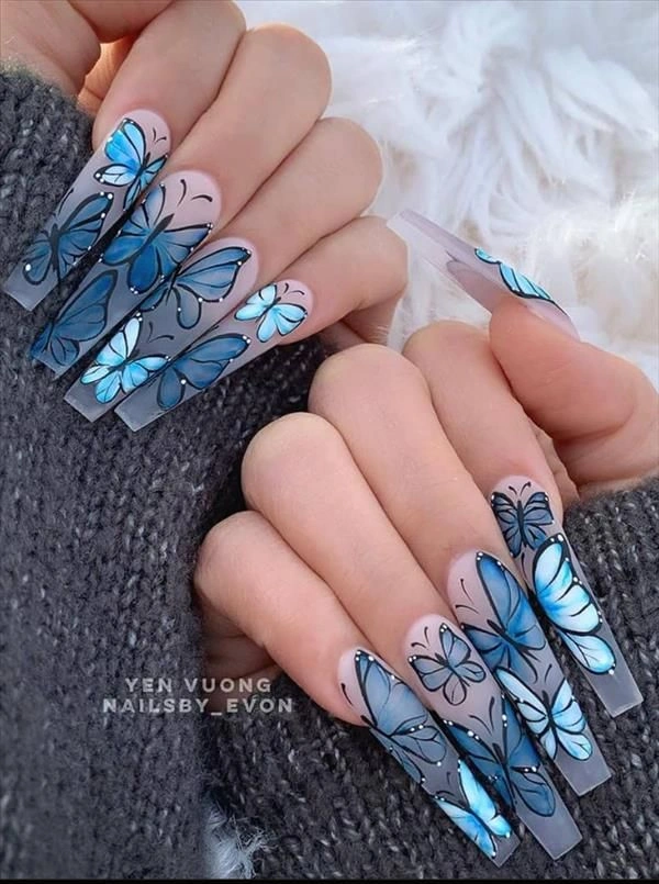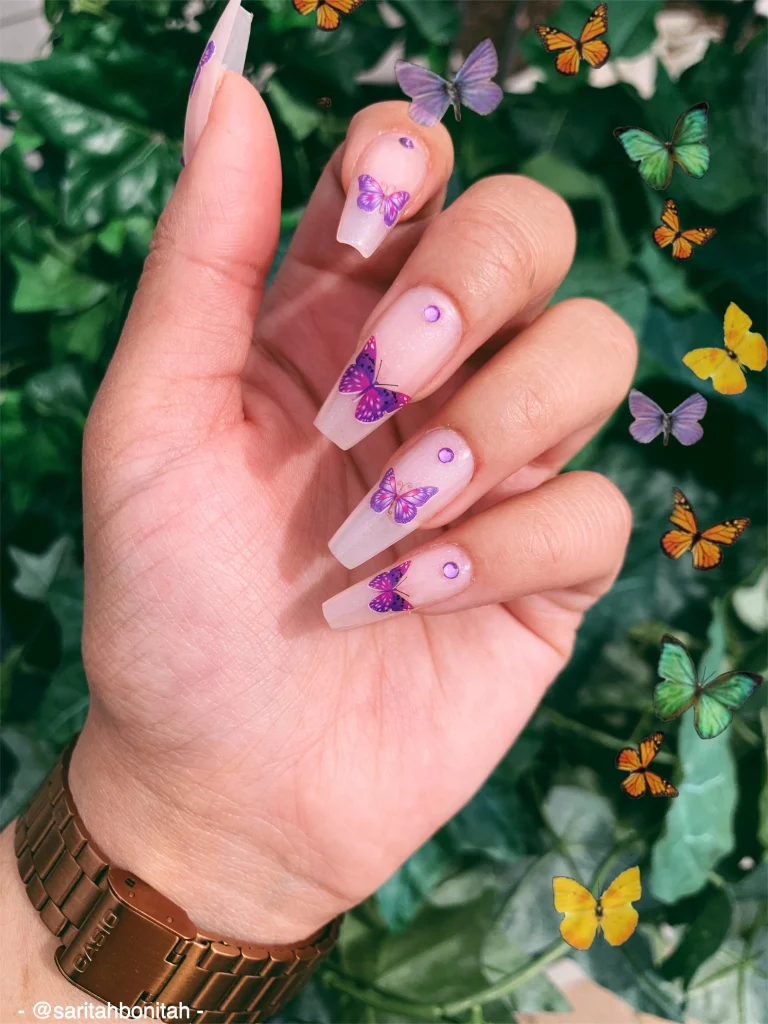 Best Nail Shape: Coffin nails highlight the butterfly details beautifully.