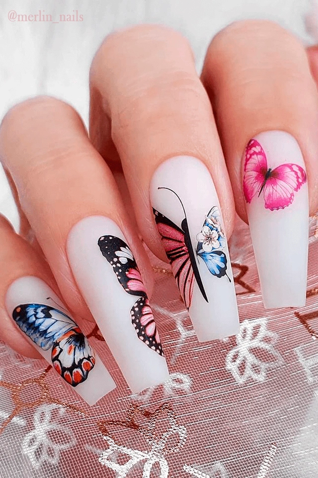 Best Nail Shape: Coffin nails are the perfect canvas for bold butterfly wing art.