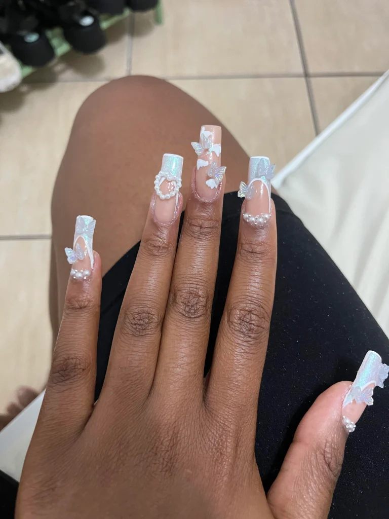 Light blue iridescence meets 3D butterfly accents in this enchanting design. Pearls and delicate heart-shaped details add a romantic touch, making the nails feel dreamy and luxurious. A perfect choice for anyone who loves statement nail art with a soft, whimsical vibe.