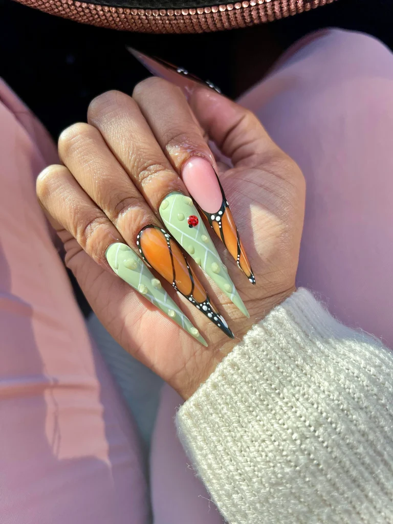 Pastel tones and bold outlines come together in this striking butterfly-inspired design. The mix of green, orange, and pink shades with delicate white dots creates a vibrant wing effect, while the tiny ladybug detail adds a playful twist. Perfect for anyone who loves colorful, nature-themed nail art with a unique edge.