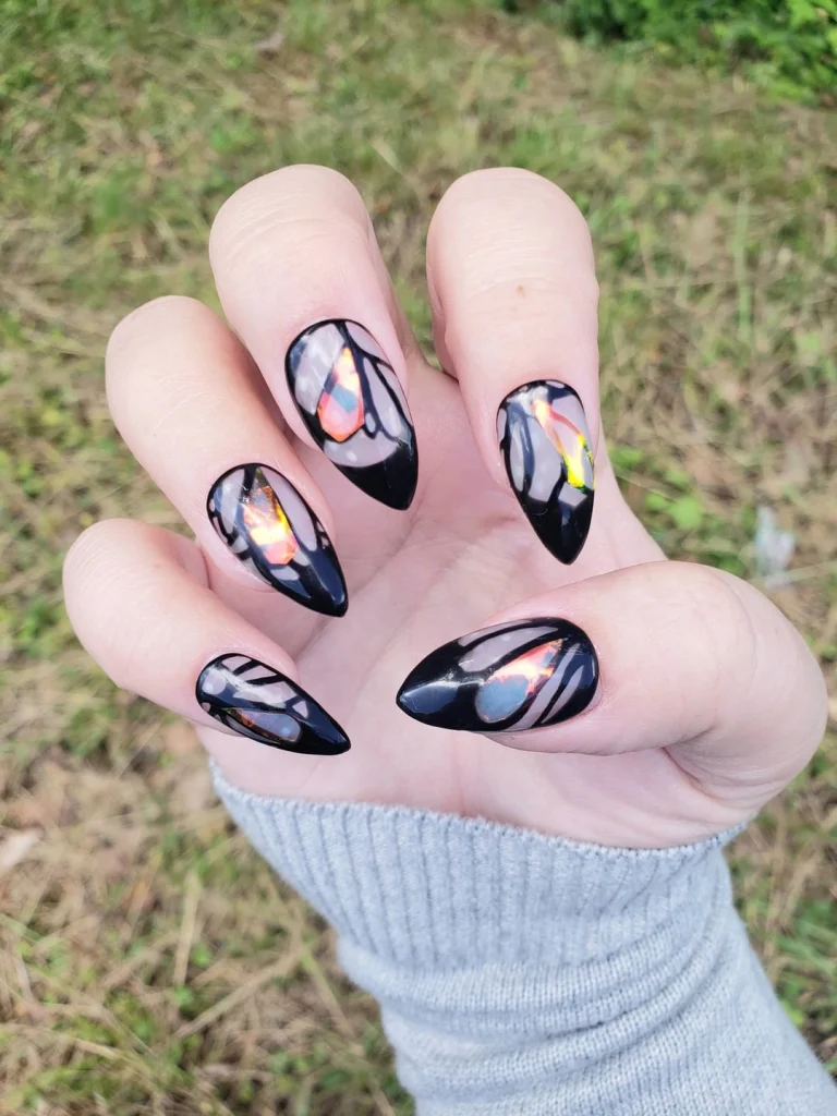 Glossy black meets stained-glass shimmer in this bold butterfly-inspired design. The reflective hues of orange, yellow, and pink dance across the dark base, creating a dramatic yet elegant look. Perfect for anyone who loves statement nails with a touch of mystery and artistry.
