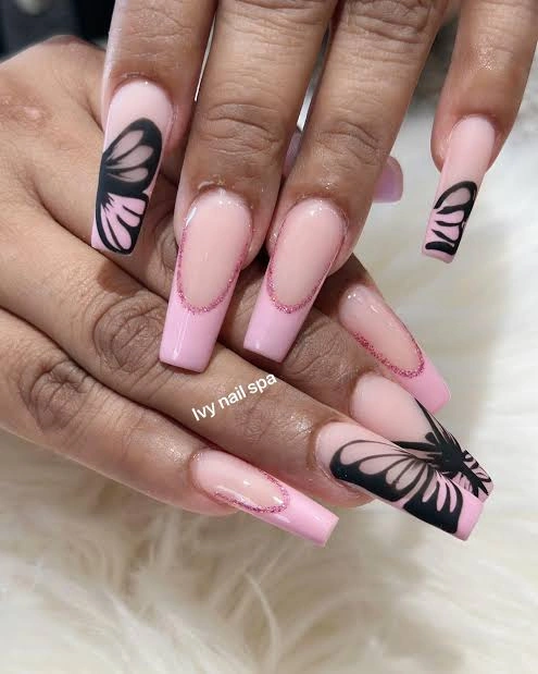 Soft pink meets delicate butterfly wings in this elegant design. The glossy finish paired with subtle glitter outlines adds just the right amount of sparkle, while black butterfly tips bring a chic, artistic touch. Perfect for anyone who loves feminine nail art with a graceful twist.