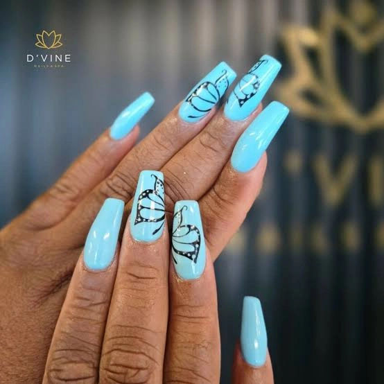 Bright sky-blue nails paired with bold black and white butterfly wings make this design pop with elegance. The crisp contrast feels fresh and artistic, giving a modern twist to classic butterfly nail art. Perfect for anyone who loves vibrant, salon-polished nails with a nature-inspired edge.