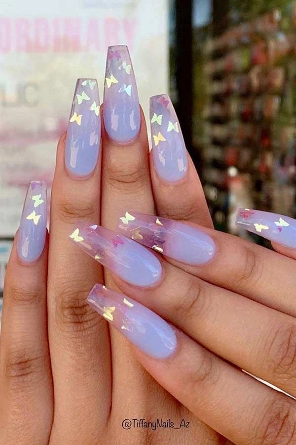 Best Nail Shape: Coffin nails showcase the lavender matte and butterfly accents perfectly.