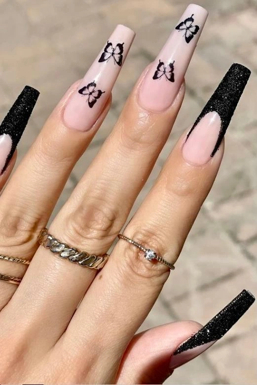 A soft nude base paired with bold black accents makes this butterfly coffin nail design stand out. Glittered tips on the thumb and pinky add extra drama, while delicate butterfly motifs on the center nails keep the look feminine and artistic. It’s a perfect mix of elegance and edge, ideal for anyone who loves statement nail art.