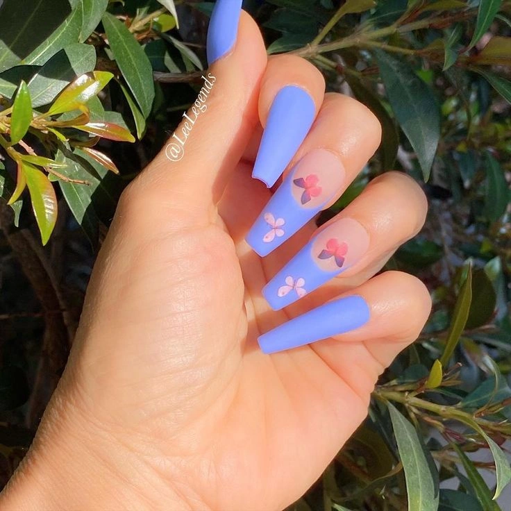 Soft pastel lavender meets delicate floral butterfly accents in this dreamy coffin nail design. The matte finish gives it a modern twist, while the clear base with tiny blossoms adds a romantic, nature-inspired vibe. It’s a perfect choice for spring days, outdoor events, or anyone who loves whimsical nail art with a chic edge.