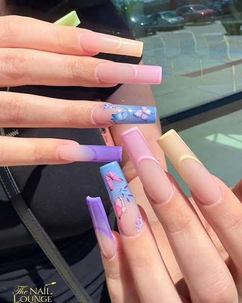 Best Nail Shape: Coffin nails highlight the pastel ombre and butterfly accents perfectly.