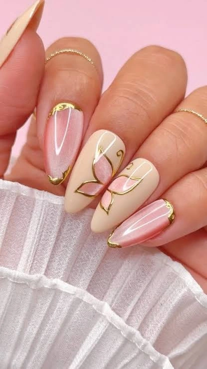 Soft nude and blush tones meet delicate golden accents in this butterfly-inspired coffin nail design. The glossy finish and shimmering outlines make it a chic choice for anyone who loves elegant, feminine nail art with a trendy twist. Perfect for spring vibes, special occasions, or simply elevating everyday style.