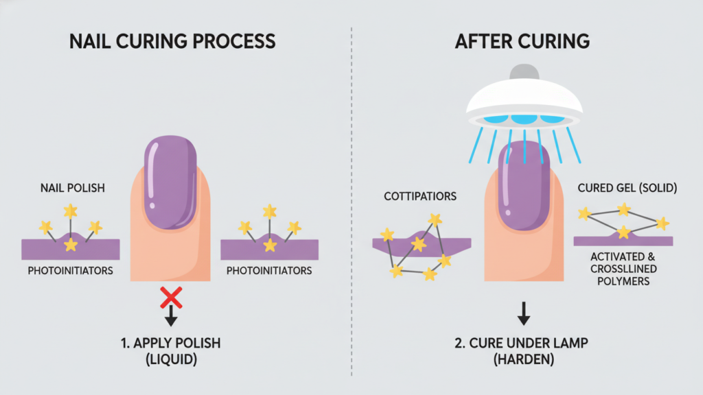 Curing is the process that solidifies gel polish. After application, nails go under either a UV lamp or an LED lamp for 30 seconds to several minutes. The light triggers the photoinitiators, causing the polish to harden almost instantly.