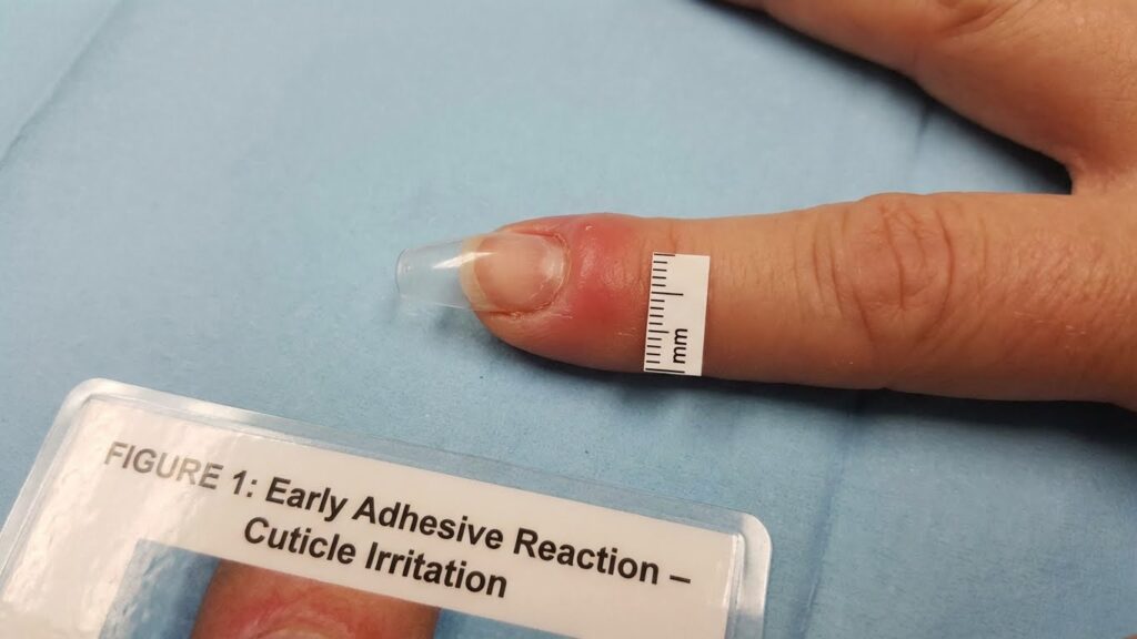 Watch for itching from adhesives or acrylic fumes. Mild chemical irritation usually appears as redness or tiny blisters on the skin near the nail and often clears within a few days when exposure stops.