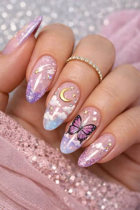 Soft pastel gradients meet whimsical butterfly accents in this dreamy nail art. Glitter sparkles and celestial details make it a perfect choice for anyone who loves playful, feminine designs. Trendy yet timeless, it’s ideal for spring vibes, festivals, or simply adding a touch of magic to everyday style.