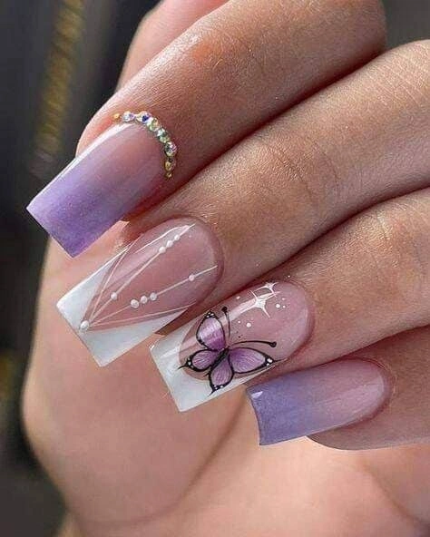 Delicate purple gradients meet clear accents and fine white linework in this elegant butterfly-inspired design. Rhinestone details add sparkle, while the butterfly motif brings a soft, feminine touch. It’s perfect for anyone who loves graceful, artistic nails with a hint of glamour.