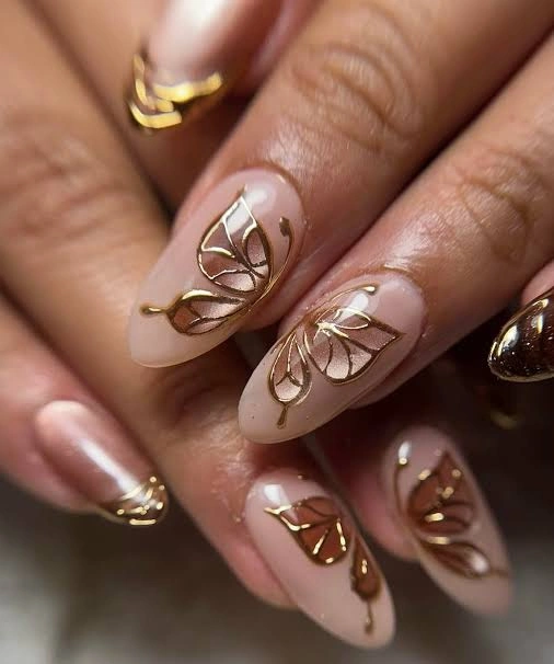 Best Nail Shape: Almond nails enhance the elegant autumn butterfly design.