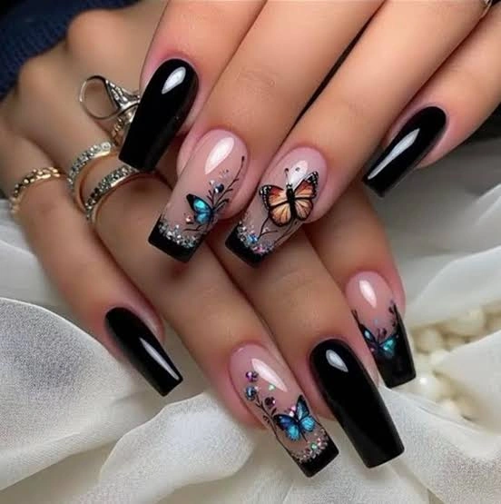 Glossy black meets soft nude tones with vibrant butterfly accents in shades of blue and orange. Glitter and floral details add extra charm, making this design a perfect mix of edgy and feminine. It’s striking, artistic, and ideal for anyone who loves nails that truly stand out.
