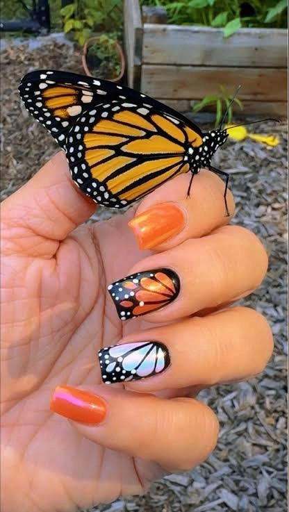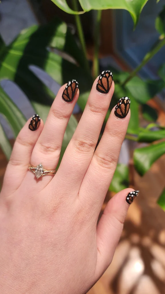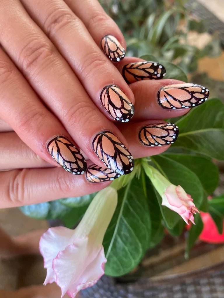 Best Nail Shape: Oval nails highlight the natural flow of the monarch wing design.
