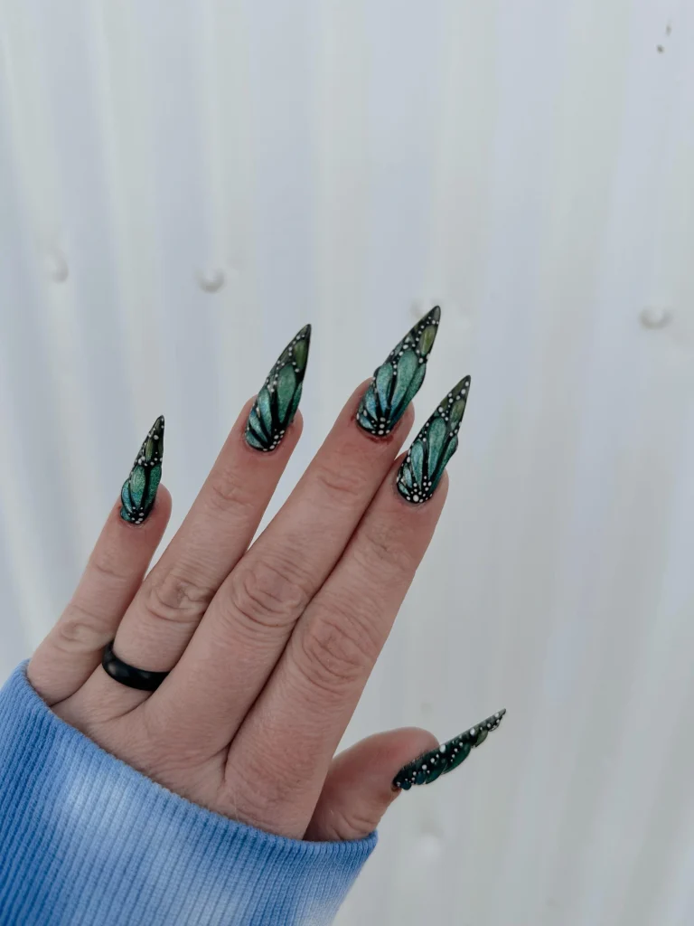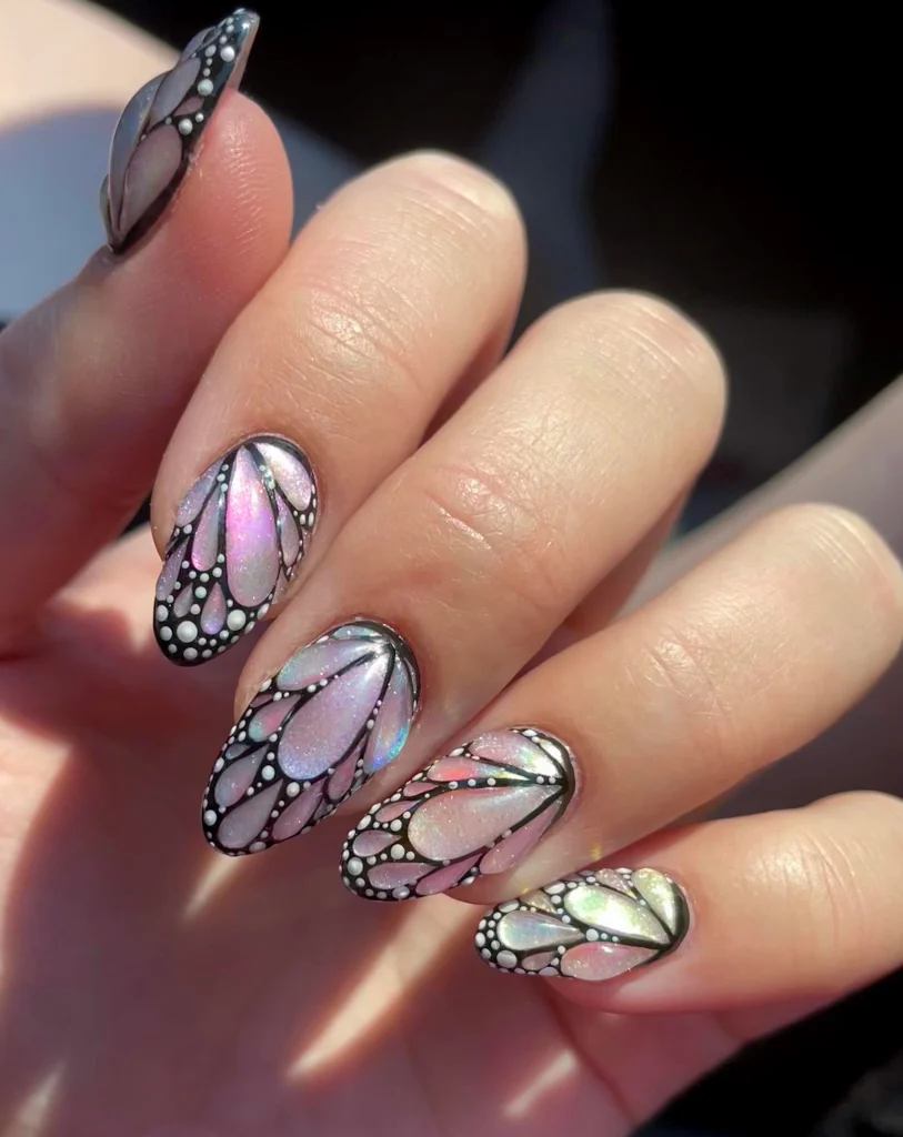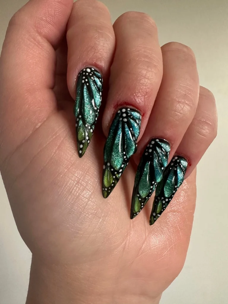 Best Nail Shape: Almond or stiletto nails highlight the elongated butterfly wing effect.