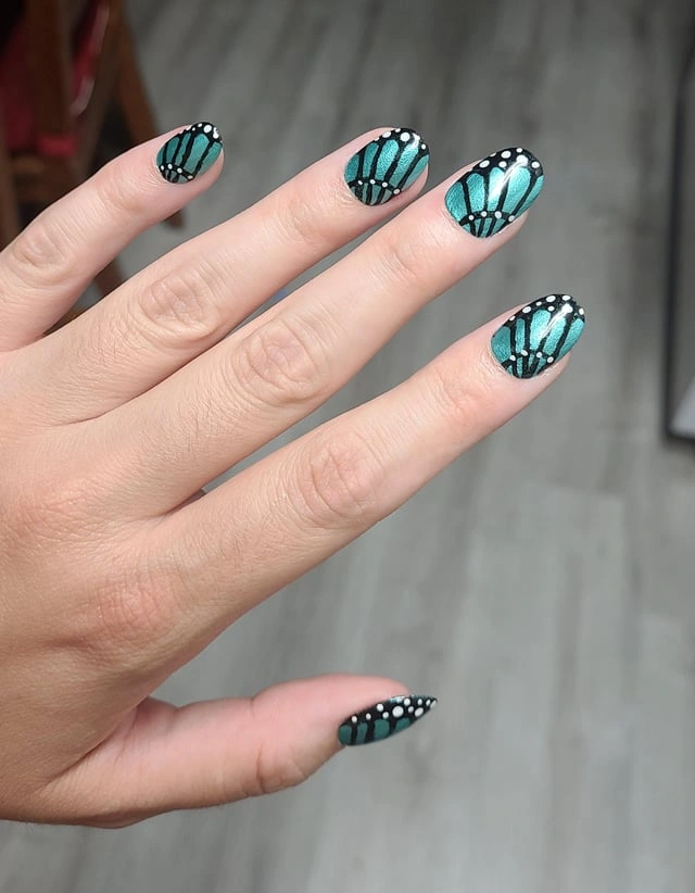 Shades of green and blue blend seamlessly across each nail, accented with black outlines and tiny white dots that capture the delicate beauty of butterfly wings. This vibrant design is perfect for anyone who loves bold, nature-inspired nail art with a touch of elegance.