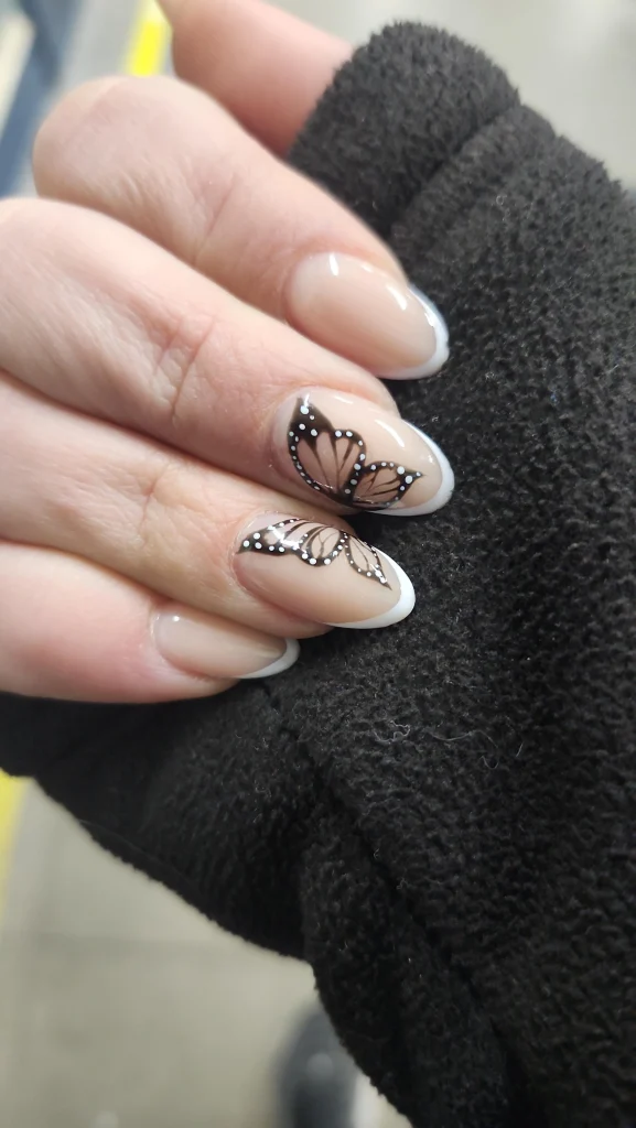 A chic nude base paired with crisp white French tips gets a whimsical upgrade with delicate butterfly wing accents in black and white. This design blends timeless elegance with playful artistry, making it perfect for anyone who loves subtle nails with a creative twist.
