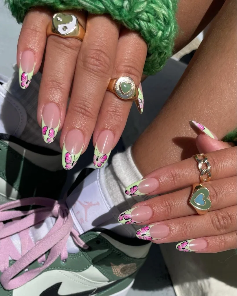 Light green French tips paired with pink butterfly accents outlined in black create a playful yet elegant look. This design is perfect for anyone who loves colorful, coordinated nail art that ties beautifully with accessories and outfits.