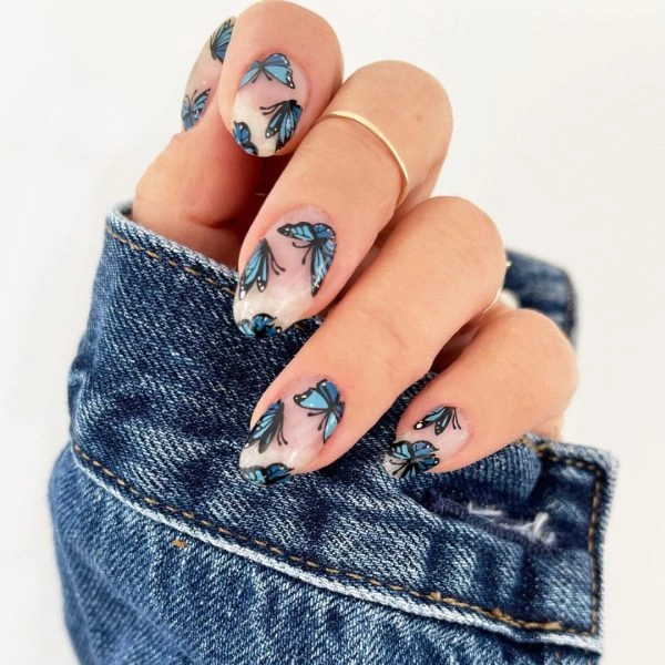 Delicate blue butterflies with black outlines and tiny white accents float across a nude base, creating a soft yet eye-catching design. This look is perfect for anyone who loves subtle elegance with a playful, nature-inspired twist.