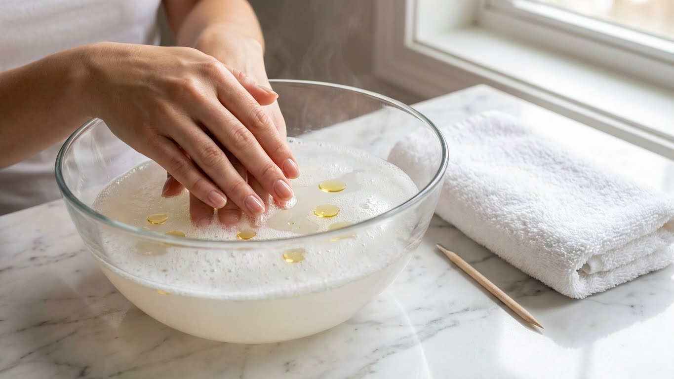 Heat and oil both help break the glue bond without acetone. Soak your nails in warm, soapy water for 15–30 minutes to soften glue edges. Refill the water if it cools.