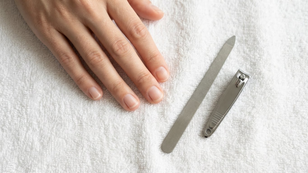 Top-down shot of neatly trimmed nails, a nail file and clippers beside them on a clean towel, soft natural light, minimal aesthetic.