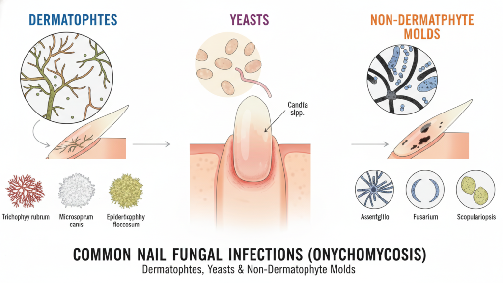 Fungal infections that affect nails are mainly caused by three groups: dermatophytes, yeasts, and non-dermatophyte molds.
