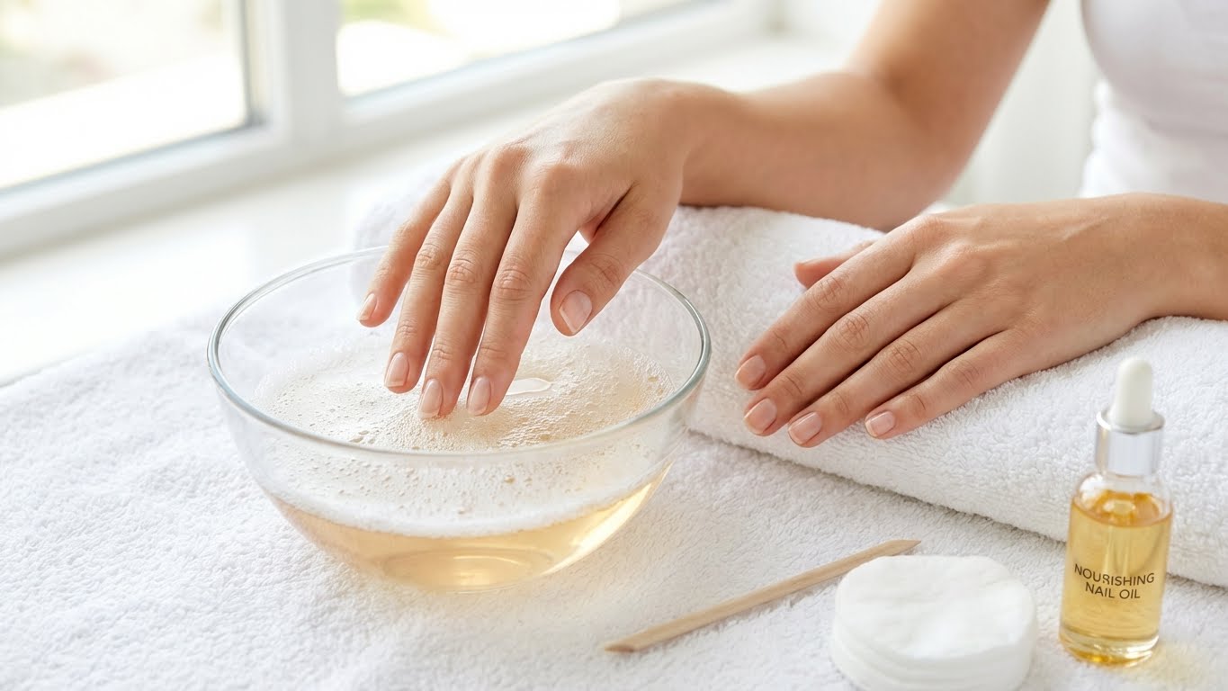 Keep nails short and file them straight across to prevent snagging. Use a fine-grit file and work in one direction to avoid peeling. If nails feel dry, soak them for 5–10 minutes in warm water with a drop of mild soap before applying oil.