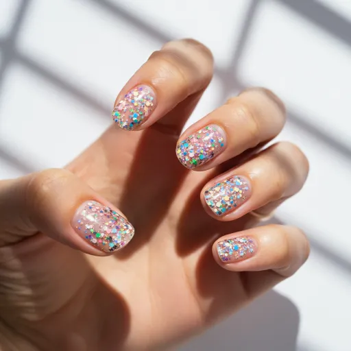 Tiny colorful flecks or glitter bits make your nails feel like a celebration. They’re cheerful, fun, and surprisingly low maintenance because any chips blend right in.
