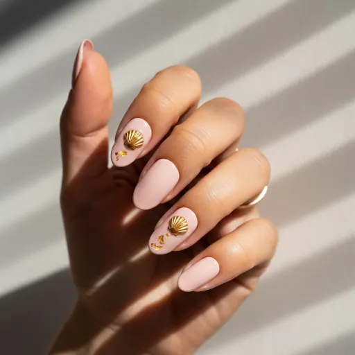 A nude base topped with little gold accents or metallic shell designs gives these nails a classy, beachy glow. They’re elegant without being flashy and can easily transition from poolside afternoons to candlelit dinners.