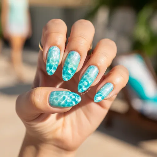 These nails take inspiration from sparkling pool water using aqua tones, glossy finishes, and cool gradients. They always look crisp, refreshing, and effortlessly cute, especially when you’re lounging by the water with a cold drink.