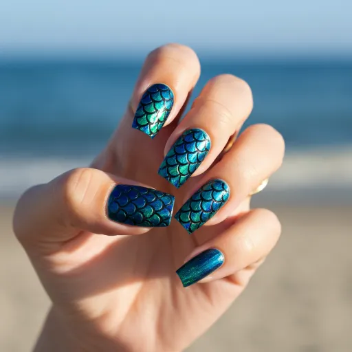 Ocean-inspired beach vacation nails in blue tones with shimmer and mermaid-style accents.
