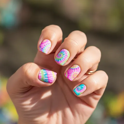 Tie-dye swirls in pastel or neon shades give an artsy, youthful feel. No two nails match perfectly, which is exactly what makes them fun. They’re lively, bright, and capture that carefree vacation vibe.