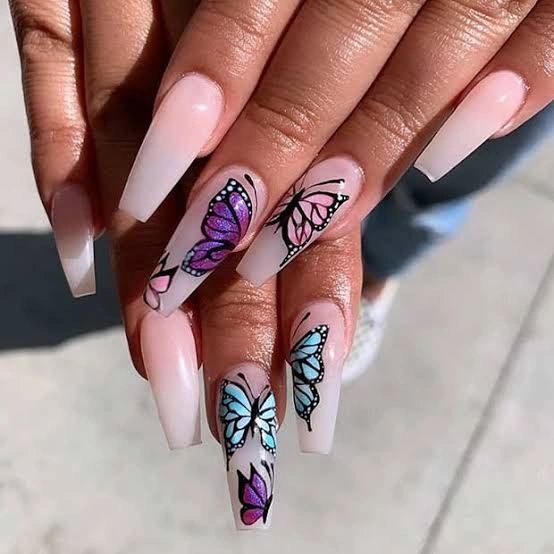 - Use fine nail art brushes or decals to create butterfly designs in purple, pink, and blue.