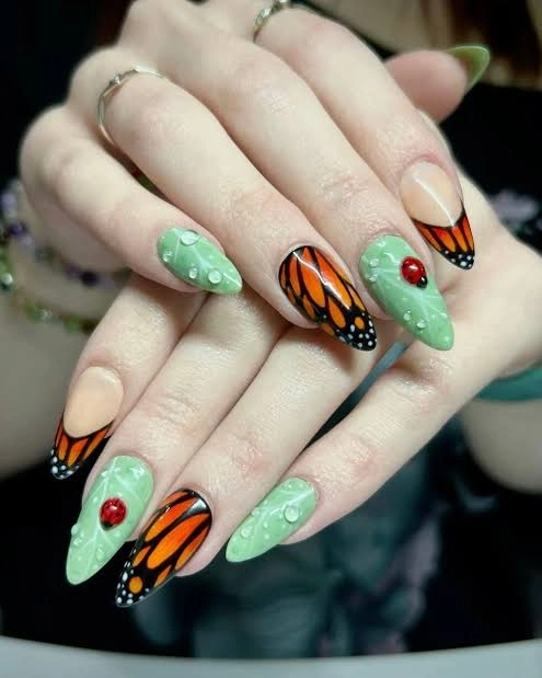 A bold mix of monarch butterfly wings and glossy green nails with ladybug accents makes this design a true showstopper. It’s perfect for nature lovers who want their manicure to feel vibrant, playful, and full of personality.
