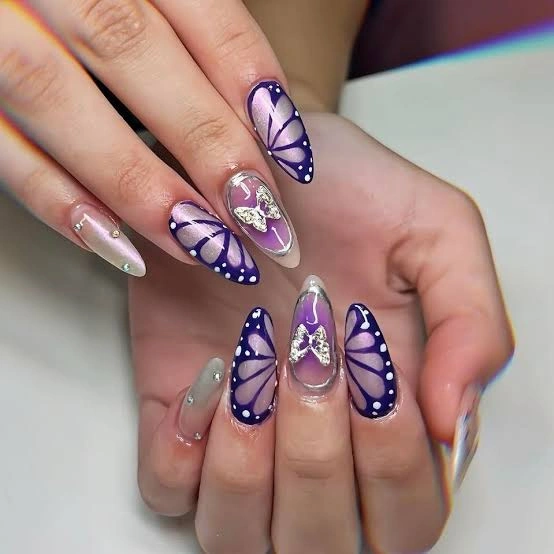 Gradient purple and lavender wings with metallic butterfly accents make this design a true statement piece. It’s artistic, elegant, and perfect for anyone who loves detailed nail art with a touch of shimmer.