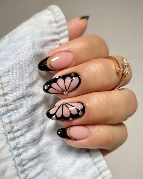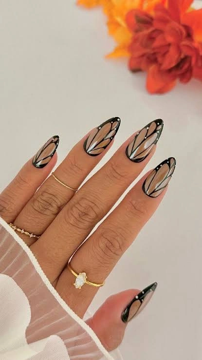Translucent nude nails with black wing outlines and delicate white dots create a chic, nature-inspired look. It’s timeless, elegant, and perfect for anyone who loves subtle nail art with a touch of sophistication.
