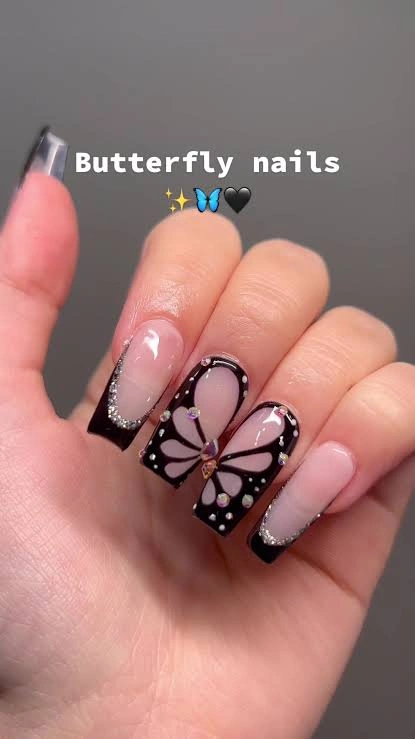Glossy black French tips paired with delicate butterfly art make this design bold yet elegant. Rhinestone accents and a gem center add sparkle, making it perfect for anyone who loves chic nail art with a glamorous twist.