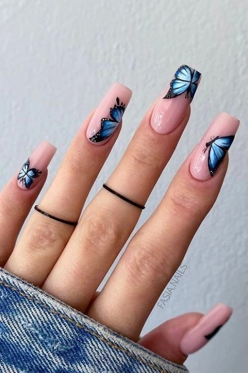 Light pink nails with detailed blue butterfly art create a fresh, delicate look that feels both artistic and modern. It’s perfect for anyone who loves soft, feminine nail designs with a bold pop of color.