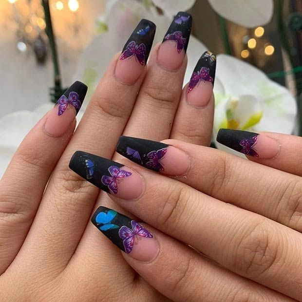 Matte black French tips paired with glossy purple and blue butterflies make this design bold and artistic. The mix of textures creates a striking contrast, perfect for anyone who loves edgy nail art with a touch of elegance.