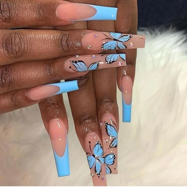 Nude nails with soft blue tips and delicate butterfly accents create a fresh, elegant vibe. Rhinestones and glitter add sparkle, making this design perfect for anyone who loves a mix of simplicity and artistry.