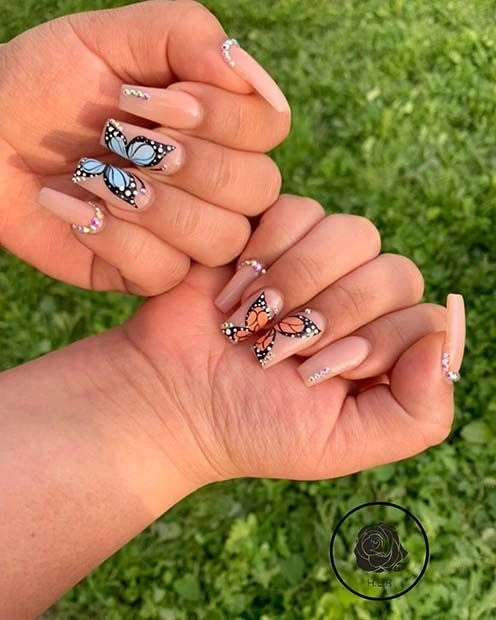 Almond and coffin nail shapes are very popular because they provide more space for butterfly designs. However, short square and oval nails can also look great with smaller butterfly accents.