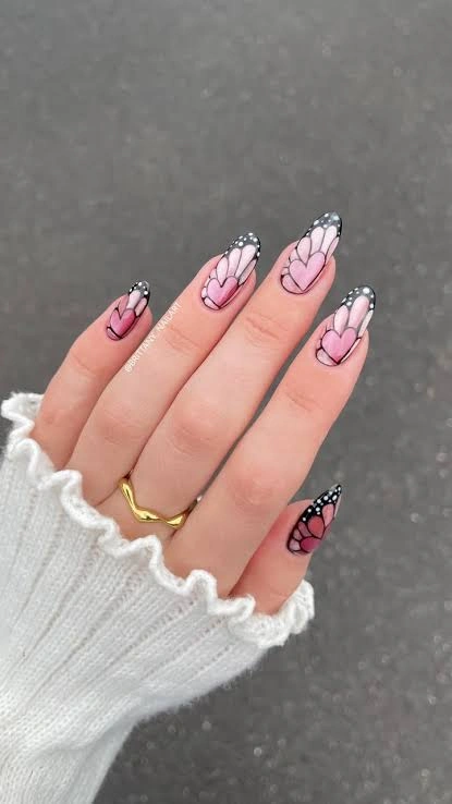 Soft pink nails with black outlines and delicate white dots create a dreamy butterfly wing effect. The gradient blending makes this design feminine and artistic, perfect for anyone who loves whimsical nail art with a touch of elegance.