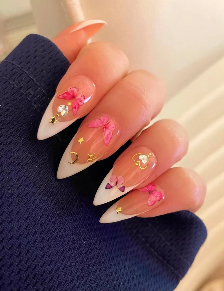 Glossy nude nails with crisp white tips get a dreamy upgrade with pink butterfly decals, gold stars, moons, and rhinestones. This whimsical design feels magical and elegant, perfect for anyone who loves celestial-inspired nail art with a romantic twist.